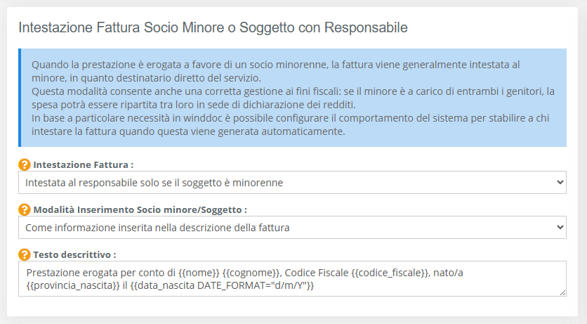 Nel caso in cui il minore venga indicato come informazione descrittiva tramite l’apposito campo, è possibile definire il testo da riportare automaticamente nel documento.Il testo può includere delle variabili, che verranno sostituite dinamicamente con i dati del minore, permettendo così di personalizzare il contenuto della fattura.Di seguito un esempio.