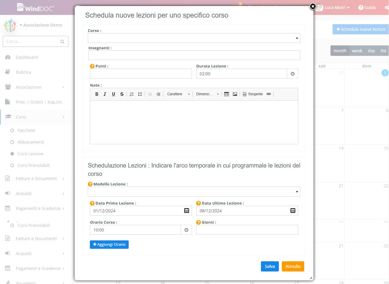 - Note: Delle note della lezione. Saranno visualizzate nel portale soci nel dettaglio della lezione.
