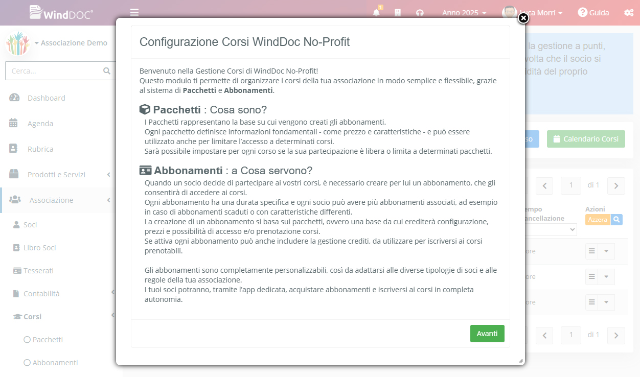 Il modulo di gestione corsi di WindDoc è progettato per semplificare l’organizzazione e la partecipazione ai corsi offerti dalla vostra associazione, garantendo un’esperienza intuitiva e flessibile per i vostri associati. Offre strumenti avanzati per amministrare e personalizzare i corsi secondo le necessità specifiche dell’associazione.