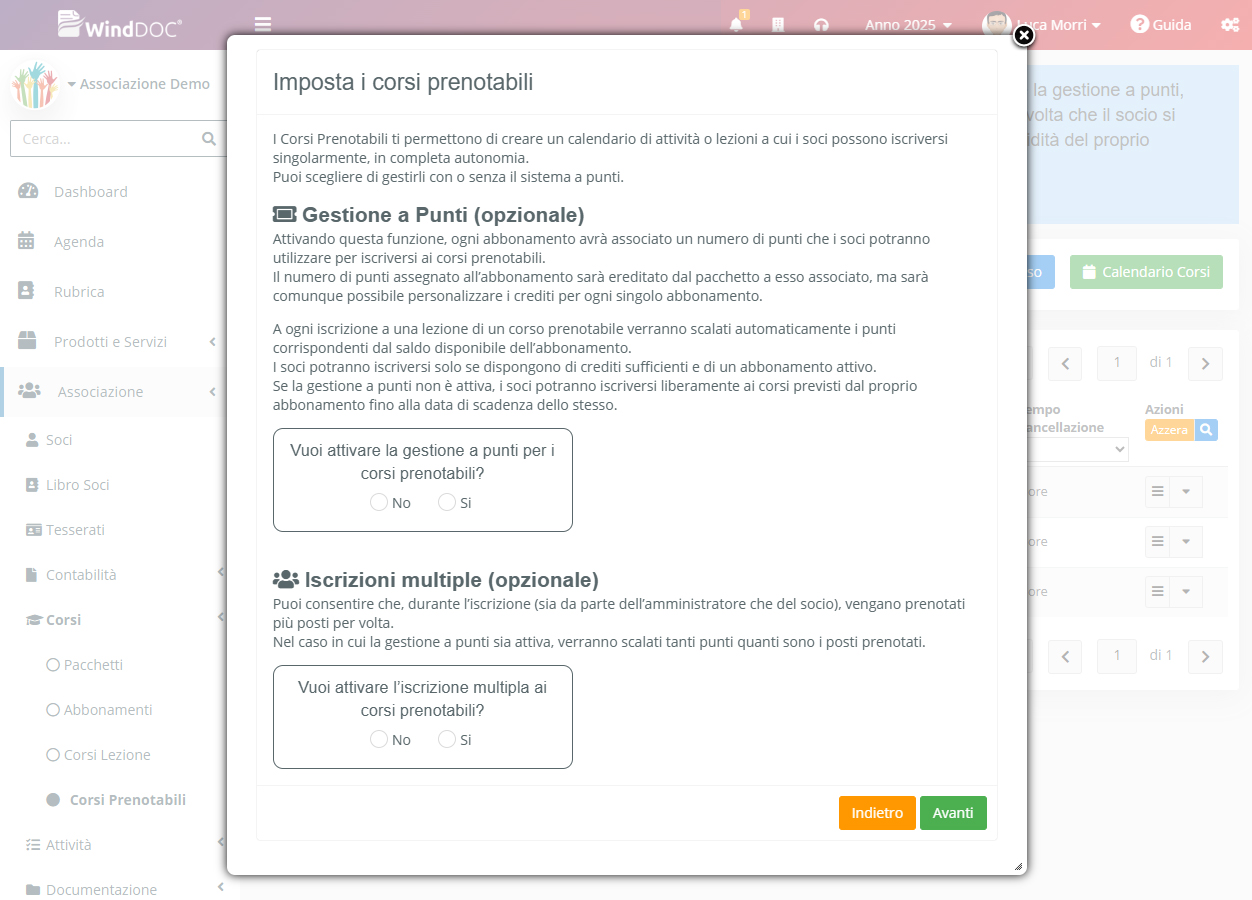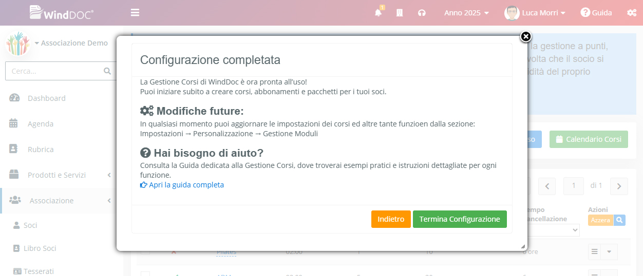 Al primo accesso alla gestione corsi si avvierà automaticamente una procedura guidata, semplice e veloce, che in pochi passaggi ti consentirà di configurare la gestione dei corsi in base alle tue esigenze. Le impostazioni inserite potranno essere in qualsiasi momento personalizzate o modificate dalla sezione Impostazioni → Personalizzazione → Gestione Moduli, all’interno dei moduli Corsi, Corsi Lezione e Corsi Prenotabili.