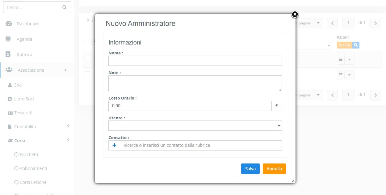 Nel campo Costo orario è possibile indicare l’importo orario dell’insegnante. Questo valore verrà utilizzato dal sistema per il calcolo della retribuzione in base alle ore di lezione svolte. Una volta completata la compilazione dei dati, premendo su Salva l’insegnante verrà registrato.