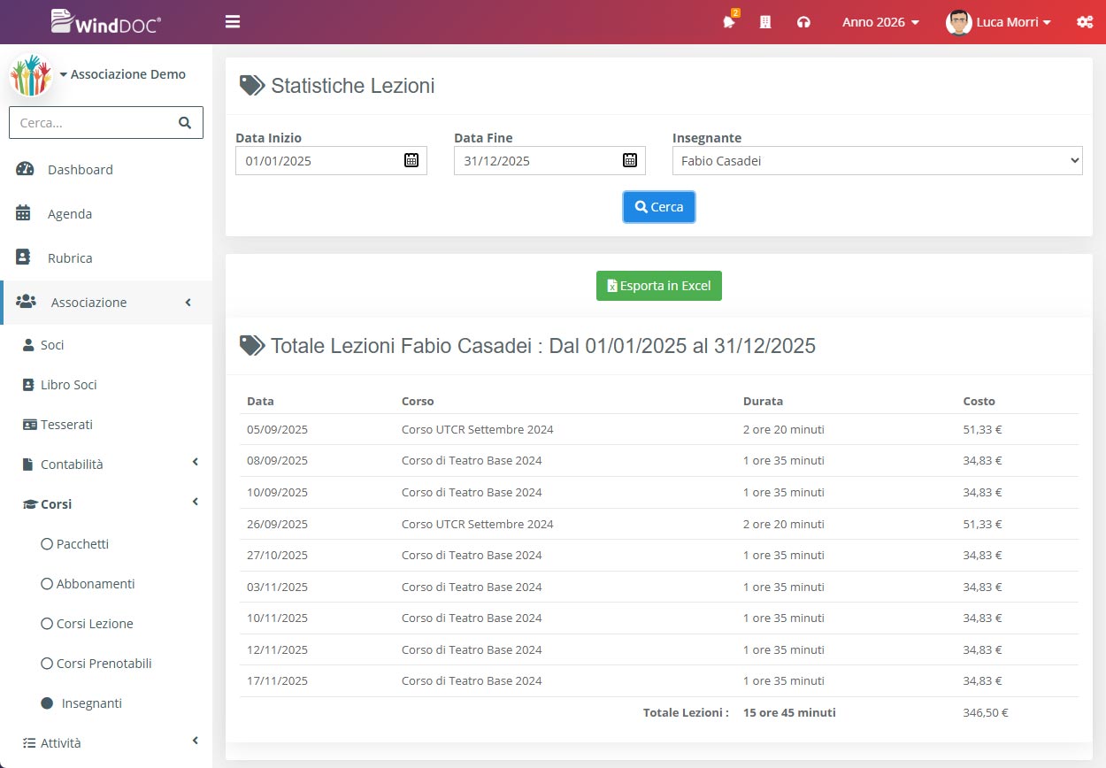 Per ogni insegnante, nel menù laterale destro, è disponibile la funzione Statistiche, che consente di generare un report di tutte le lezioni svolte. In questa sezione è possibile impostare un intervallo di date e, premendo su Cerca, visualizzare l’elenco delle lezioni effettuate (sono escluse le lezioni annullate), con l’indicazione della durata di ciascuna lezione e, se configurato, del costo calcolato in base al costo orario associato all’insegnante.