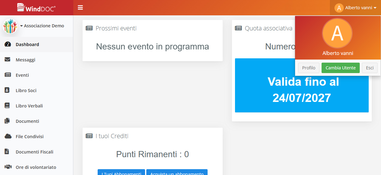 Dal Portale Soci, il socio potrà cambiare profilo in qualsiasi momento cliccando in alto a destra sul proprio nome e selezionando il pulsante “Cambia utente”. Verrà così mostrato l’elenco di tutte le anagrafiche che può gestire, dalle quali potrà scegliere quella desiderata per accedere direttamente al relativo portale.