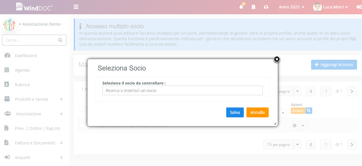 Per consentire la gestione di un ulteriore profilo, è sufficiente cliccare sul pulsante “Aggiungi Accesso”, selezionare il socio da associare e salvare le modifiche. In questo modo, il socio principale potrà accedere anche al profilo aggiuntivo.